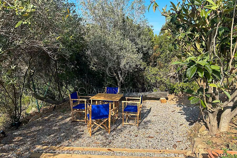 Various seating areas. Decent sized pool (8m x 4m) with sun loungers. Private garden with direct access to a path which leads to the beach (10/15 minute walk).